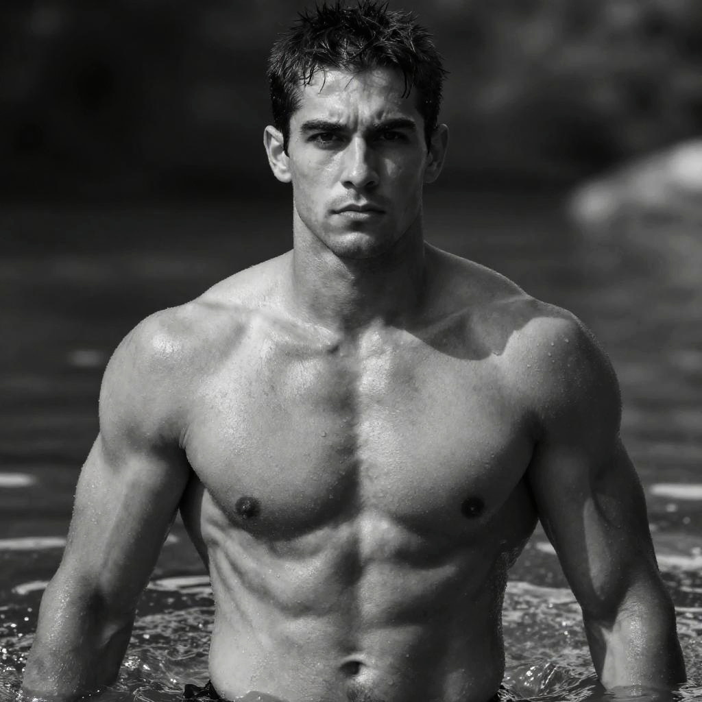 A muscular man stands waist-deep in water, showcasing his well-defined physique in a striking black and white portrait. The intense expression on his face emphasizes strength and determination, capturing the essence of fitness and masculinity.