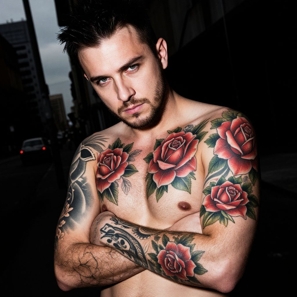 A shirtless man with intense blue eyes poses confidently in an urban setting, showcasing his extensive tattoos of vibrant red roses and other intricate designs on his chest and arms. The dramatic lighting emphasizes the detailed ink work against a dark city backdrop, highlighting a bold and rebellious style.