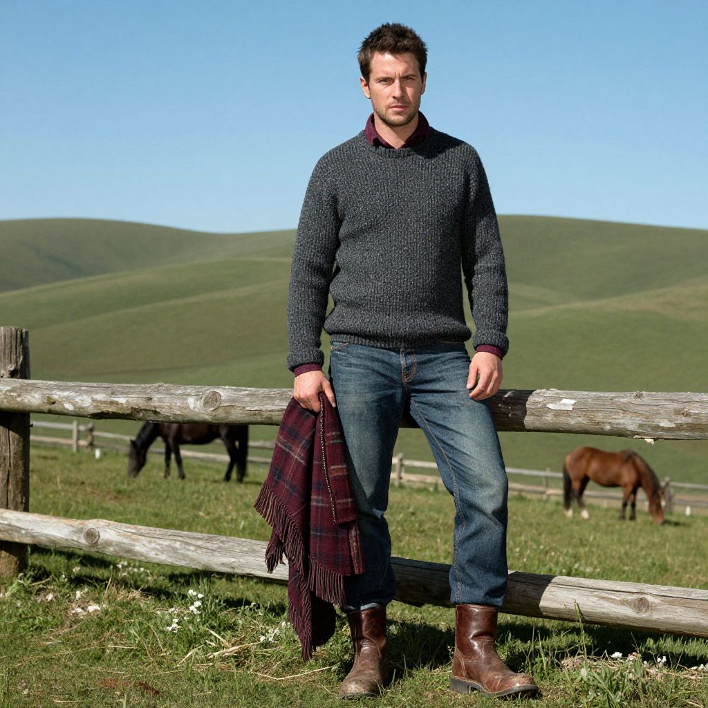 A man stands confidently in a rustic outdoor setting, dressed in a cozy knit sweater, jeans, and sturdy leather boots. He holds a plaid blanket while a wooden fence and grazing horses create a peaceful countryside backdrop under a clear blue sky.