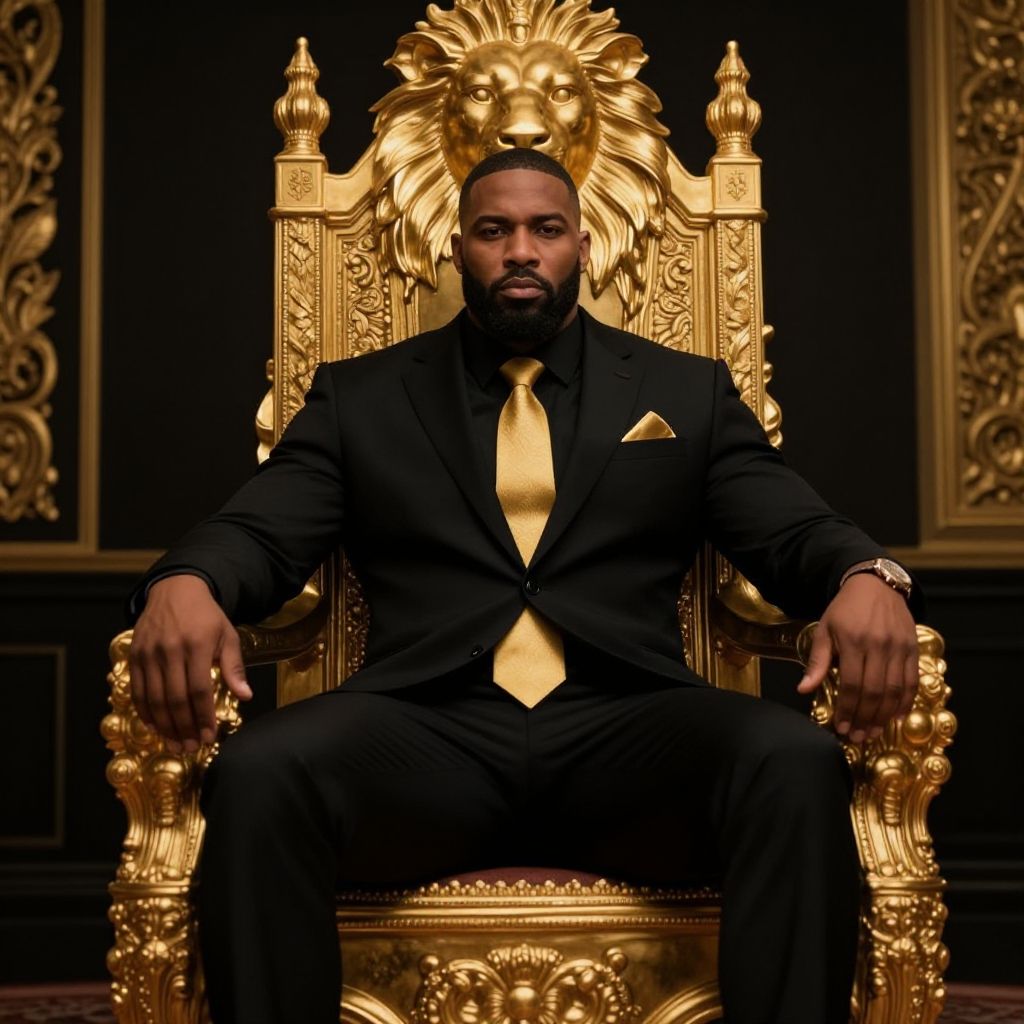 A confident man dressed in a black suit with a gold tie and pocket square sits authoritatively on an ornate golden throne adorned with a lion's head. The luxurious, regal setting emphasizes power and elegance.