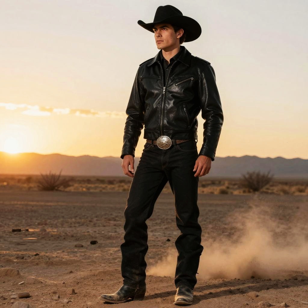 A young man dressed in classic cowboy attire stands confidently in a desert landscape during sunset. He wears a black leather jacket, black jeans, a wide-brimmed cowboy hat, and boots, evoking a rugged western style. The warm tones of the setting sun highlight the dramatic and timeless atmosphere of the scene.