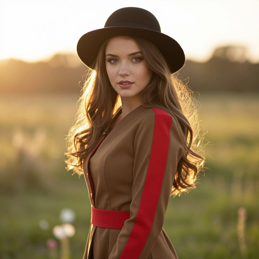 Elegant Woman in Brown Dress and Black Hat in Golden Hour Light