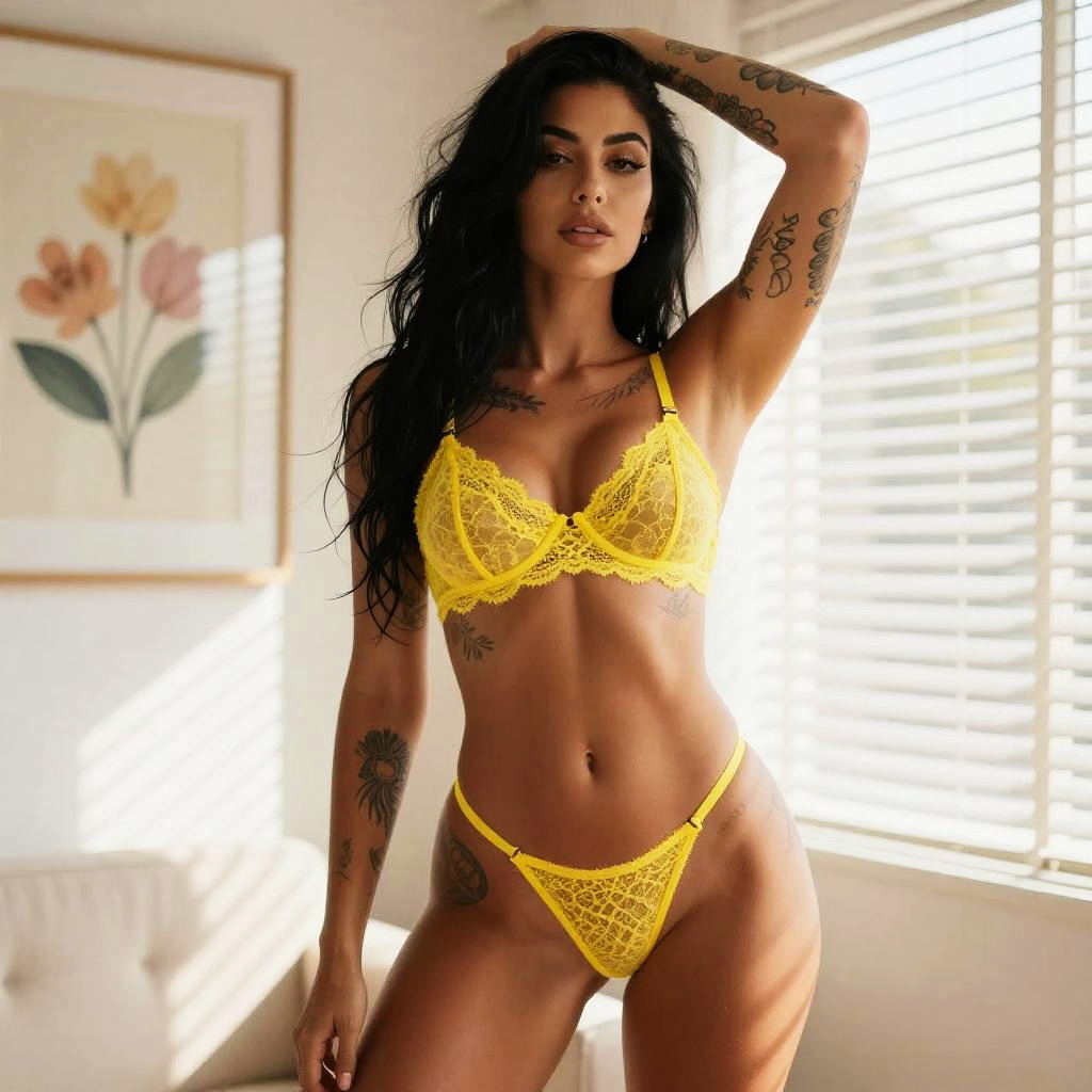 A confident woman poses in a bright yellow lace lingerie set, showcasing intricate floral patterns and delicate straps. She stands in a sunlit room with soft natural light streaming through window blinds, highlighting her tattoos and toned figure.