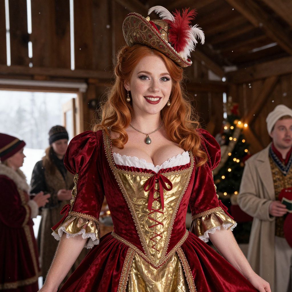 A smiling red-haired woman dressed in an elegant, historical costume featuring a rich red velvet gown with gold brocade accents and lace trim. She is wearing a decorative hat adorned with feathers and pearl earrings, standing in a warmly lit rustic indoor setting with other people dressed in period attire in the background.