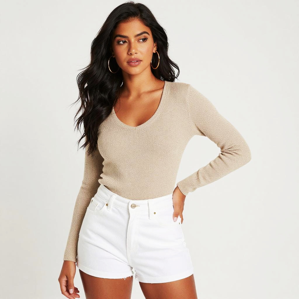A confident woman with long, wavy dark hair poses against a plain background, wearing a fitted beige long-sleeve top paired with high-waisted white shorts. The image highlights casual, stylish fashion with a clean and minimalistic aesthetic.