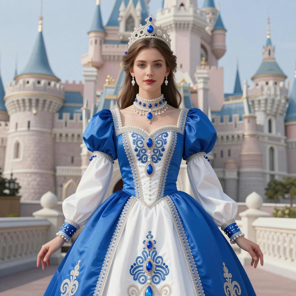 A young woman dressed as a princess stands gracefully in front of a majestic castle backdrop, wearing an elaborate royal blue and white gown adorned with intricate beading and gemstone details. Her look is completed with a sparkling tiara and matching jewelry, evoking a classic fairytale aesthetic.