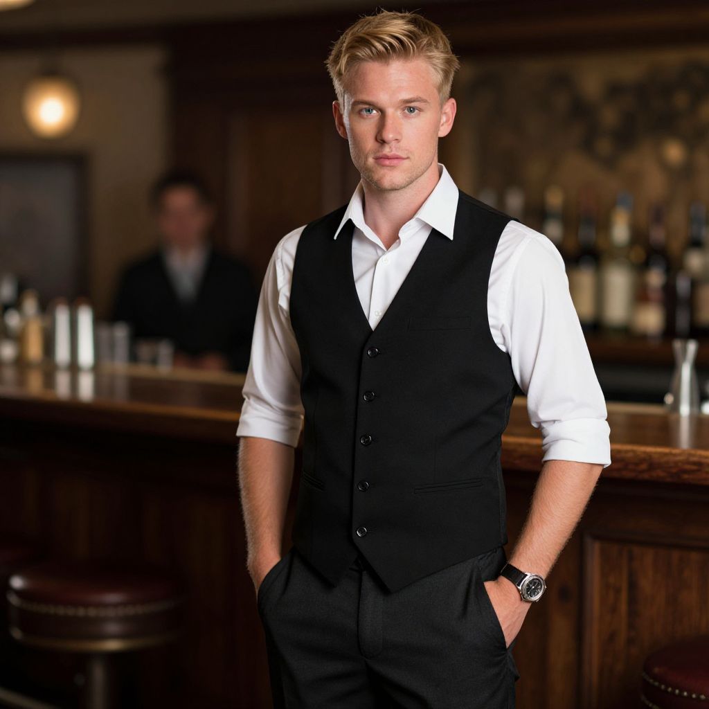 A young man dressed in a classic black vest and white shirt stands confidently in a dimly lit bar setting. The image captures a stylish and professional atmosphere with warm wooden tones and a relaxed yet poised demeanor. The background features blurred bottles and another person, enhancing the depth and context of the scene.