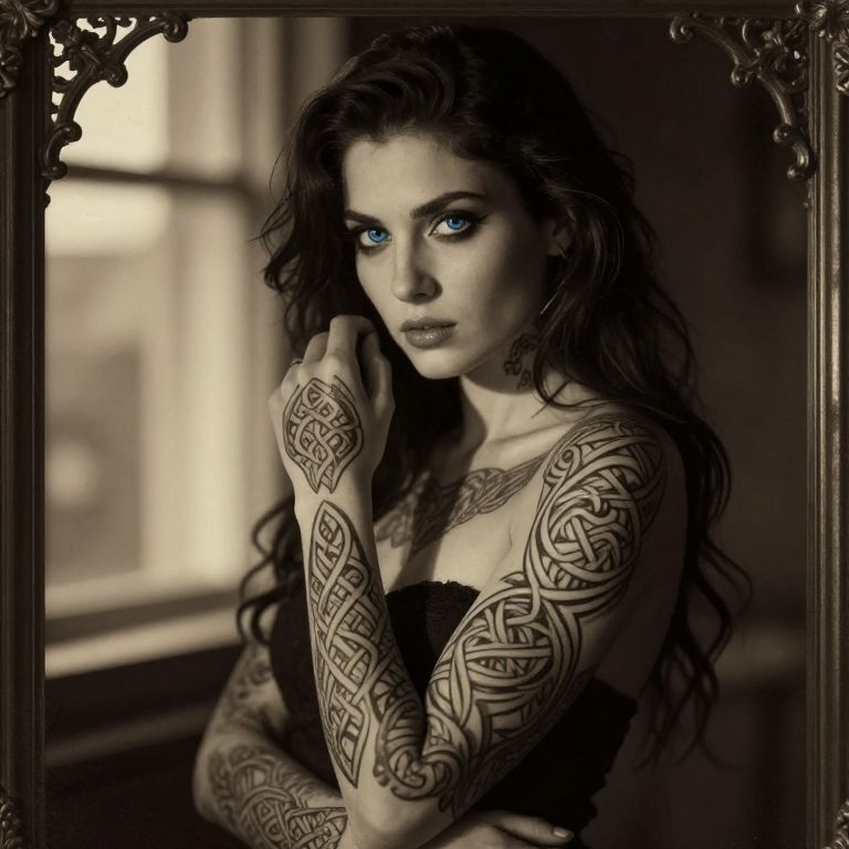 A striking portrait of a woman with long dark hair and intense blue eyes, adorned with intricate Celtic-style tattoos covering her arms and part of her chest. The sepia-toned image features a vintage frame that enhances the mysterious and artistic atmosphere of the photograph.
