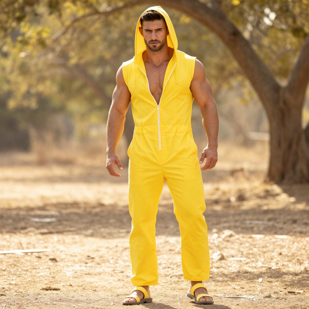 A muscular man wearing a bright yellow sleeveless hooded jumpsuit stands confidently in an outdoor setting with trees and soft natural light. The vibrant outfit contrasts with the earthy background, highlighting his strong physique and focused expression.