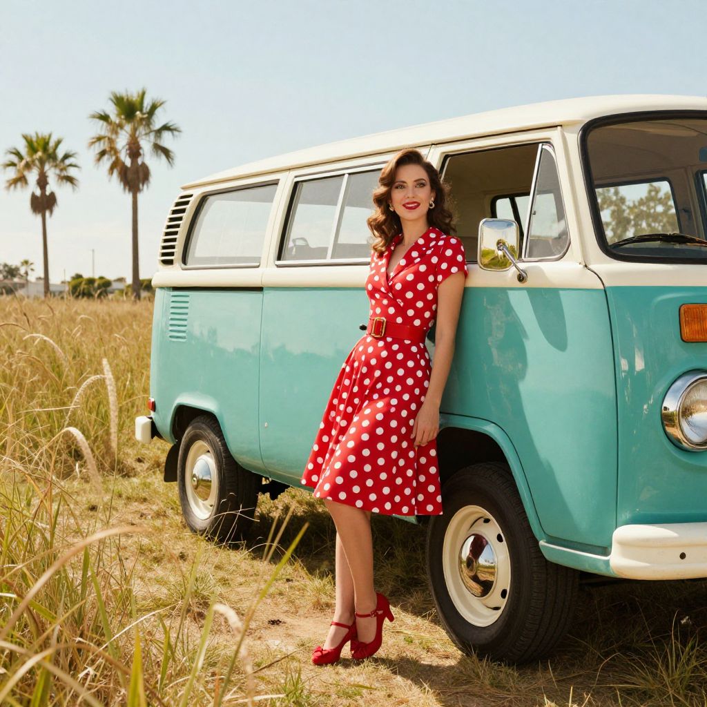 A woman dressed in a vintage red polka dot dress poses confidently beside a classic turquoise and white retro van in a sunlit field. The scene captures a nostalgic, mid-20th century vibe with palm trees in the background, evoking a sense of timeless style and summer freedom.