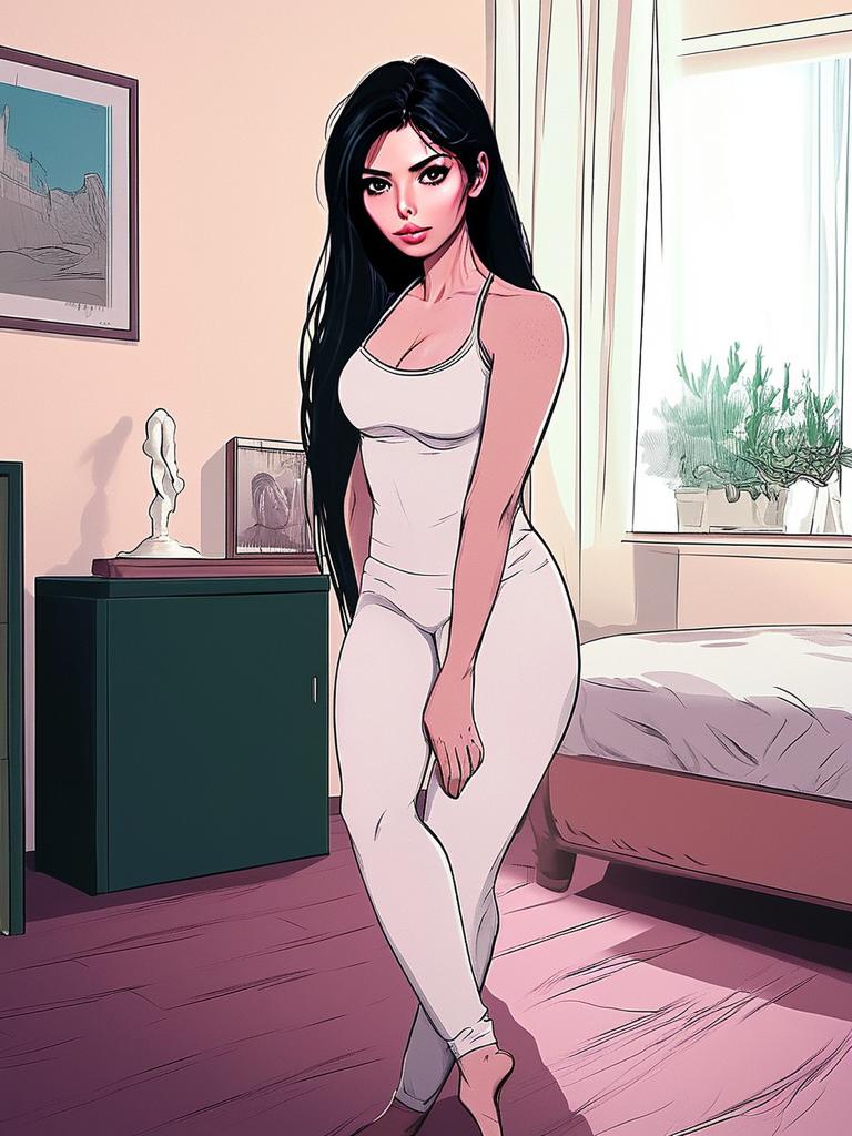 A beautifully illustrated woman walks confidently along a sandy shoreline, exuding a sense of warmth and tranquility. Her flowing hair and vibrant orange attire complement the serene beach setting, creating a harmonious blend of nature and style. This artwork captures a moment of carefree elegance set against a glowing sunset backdrop.