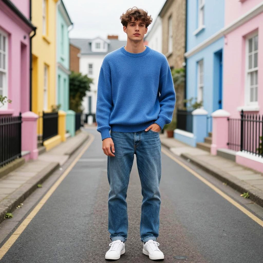 A young man stands confidently in the middle of a narrow street lined with vibrant, pastel-colored houses, wearing a cozy blue sweater, classic blue jeans, and white sneakers. The urban setting combined with casual fashion reflects a modern Gen Z street style vibe.