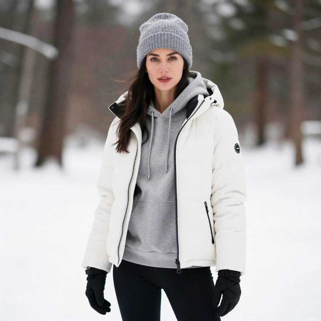 A woman stands outdoors in a snowy setting, dressed in a casual winter outfit featuring a white puffer jacket over a grey hoodie, paired with black gloves and a grey knit beanie. The attire highlights a comfortable, layered look suitable for cold weather, reflecting a modern and practical winter style.