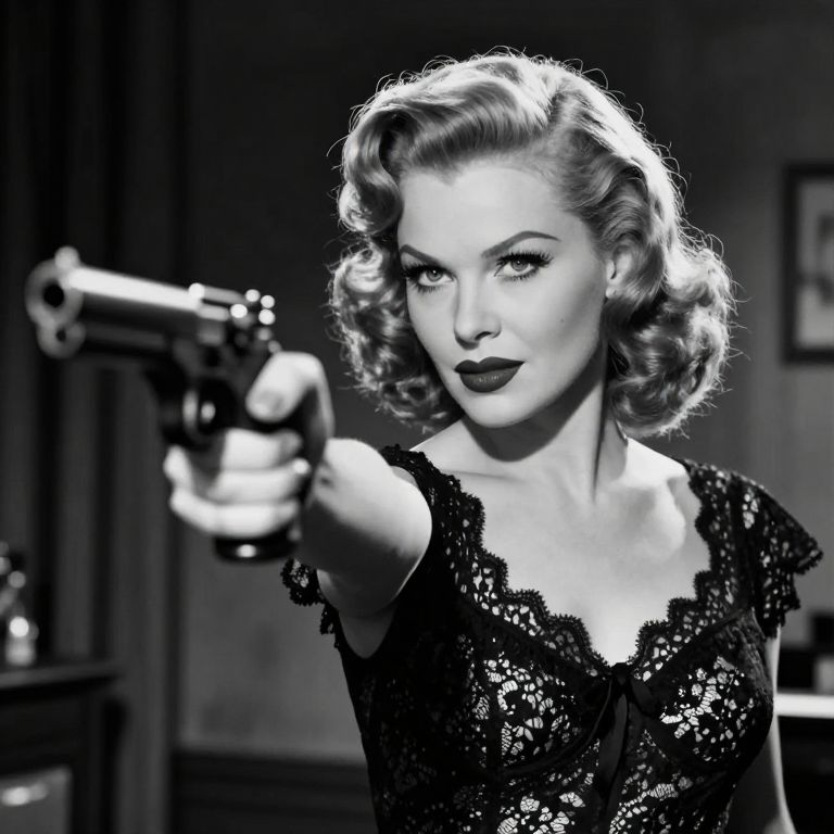 A glamorous woman in vintage attire confidently points a handgun, epitomizing the classic film noir style. The black and white image captures her intense gaze and 1940s-inspired hairstyle and makeup, set against a softly blurred interior background.