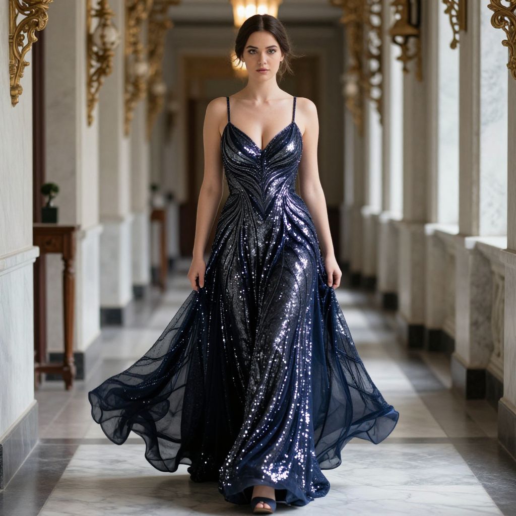 Elegant Woman in Navy Blue Sequined Evening Gown Walking Through Marble Corridor