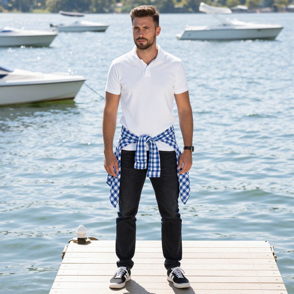 A young man stands confidently on a wooden dock by the water, dressed casually in a white polo shirt, black jeans, and black sneakers. He has a blue and white checkered shirt tied around his waist, with boats and calm water visible in the background, creating a relaxed lakeside atmosphere.