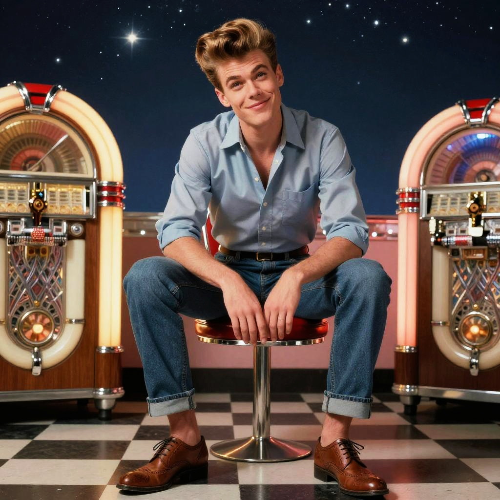 A young man with a retro 1950s hairstyle and casual attire sits confidently on a stool between two classic jukeboxes, set against a starry night backdrop. The scene evokes a nostalgic diner atmosphere with checkered flooring and vintage style offerings.
