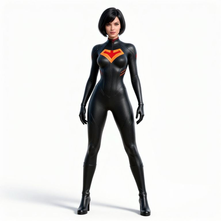 A confident woman stands in a sleek, futuristic black bodysuit featuring a bold red and orange emblem on the chest. The high-tech, tight-fitting suit highlights a modern superhero aesthetic with clean lines and subtle detailing, exuding strength and elegance.
