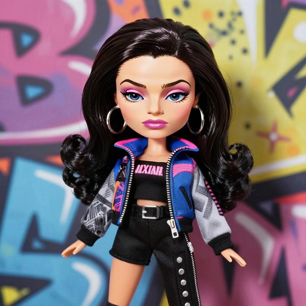 This image features a stylish fashion doll with long, voluminous dark hair and striking blue eyes, dressed in a trendy urban outfit consisting of a cropped top, high-waisted shorts, and a patterned jacket. The vibrant background with graffiti art complements the doll’s modern and edgy street style, capturing a Gen Z vibe.