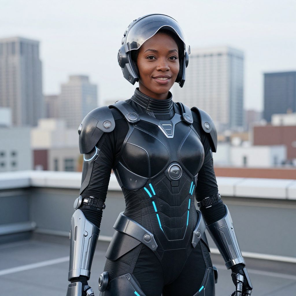 A confident woman wearing a sleek, futuristic black armored suit with blue LED accents stands on a rooftop against a blurred cityscape background. Her high-tech gear includes a helmet, shoulder pads, and arm guards, suggesting a sci-fi or cyberpunk style. The photo captures a blend of advanced technology and strong, modern female presence.