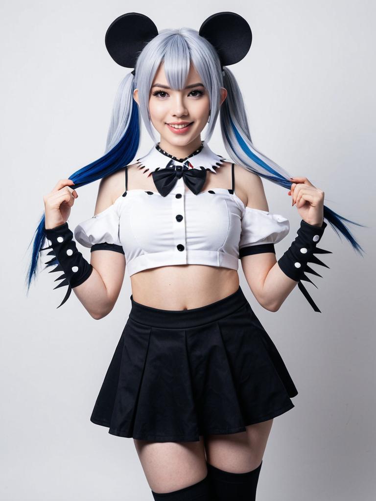A woman is dressed in a Hakos Baelz-inspired cosplay outfit featuring a white crop top with black buttons, a black bow tie, and a short black skirt. She sports long, styled silver hair with blue streaks tied in twin ponytails, complete with black mouse ear accessories and spiked wristbands, capturing a playful and dynamic anime style.