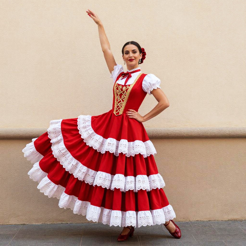 A woman poses gracefully in a vibrant red traditional Tarantella dress, characterized by its full, tiered skirt adorned with white lace and puffed sleeves. The outfit is complemented by intricate gold embroidery on the bodice, matching red shoes, and red flowers in her hair, embodying the classic style of Southern Italian folk dance attire.