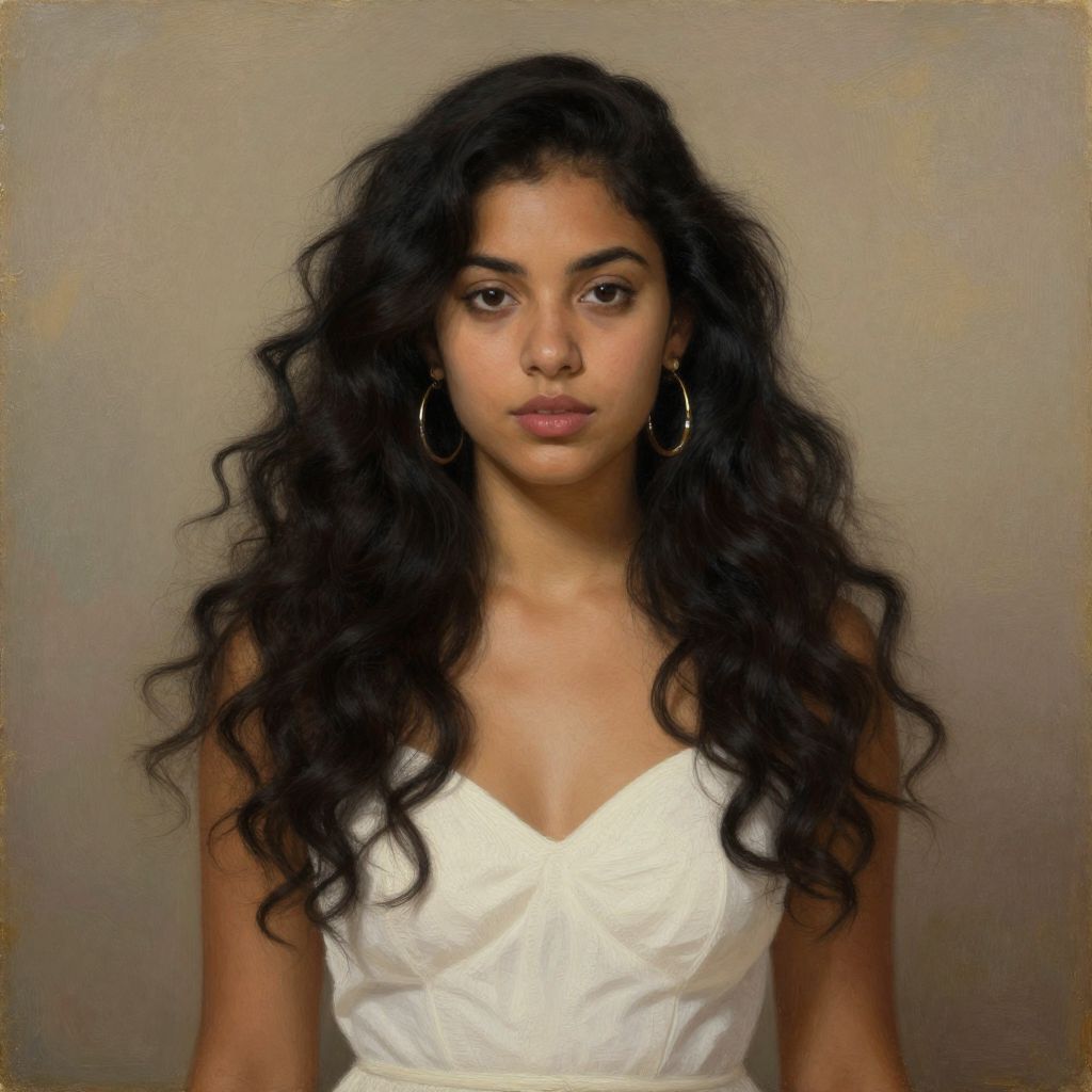 A portrait of a young woman with long, wavy black hair wearing a white dress and gold hoop earrings, set against a neutral beige background. The image showcases a classical, painterly style reminiscent of traditional oil portraiture, highlighting soft textures and natural lighting.