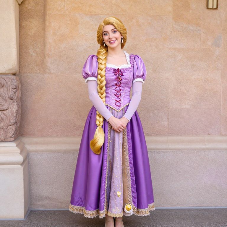 A woman dressed as Rapunzel from the classic fairy tale stands against a beige stone wall, wearing a vibrant purple dress with puffed sleeves and intricate gold detailing. Her long, blonde braid is styled traditionally, complementing the princess costume in a bright and approachable portrait.