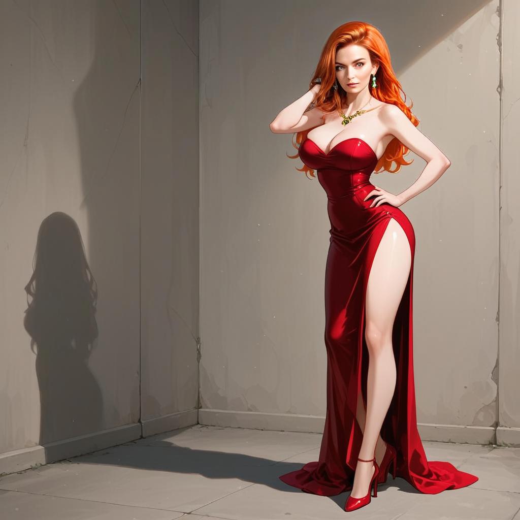 A striking woman with fiery red hair poses confidently in a glossy, floor-length dark red evening gown featuring a dramatic thigh-high slit. The image showcases a blend of realism and digital illustration, highlighting the figure’s elegant posture and the reflective texture of the dress against a minimalistic background.
