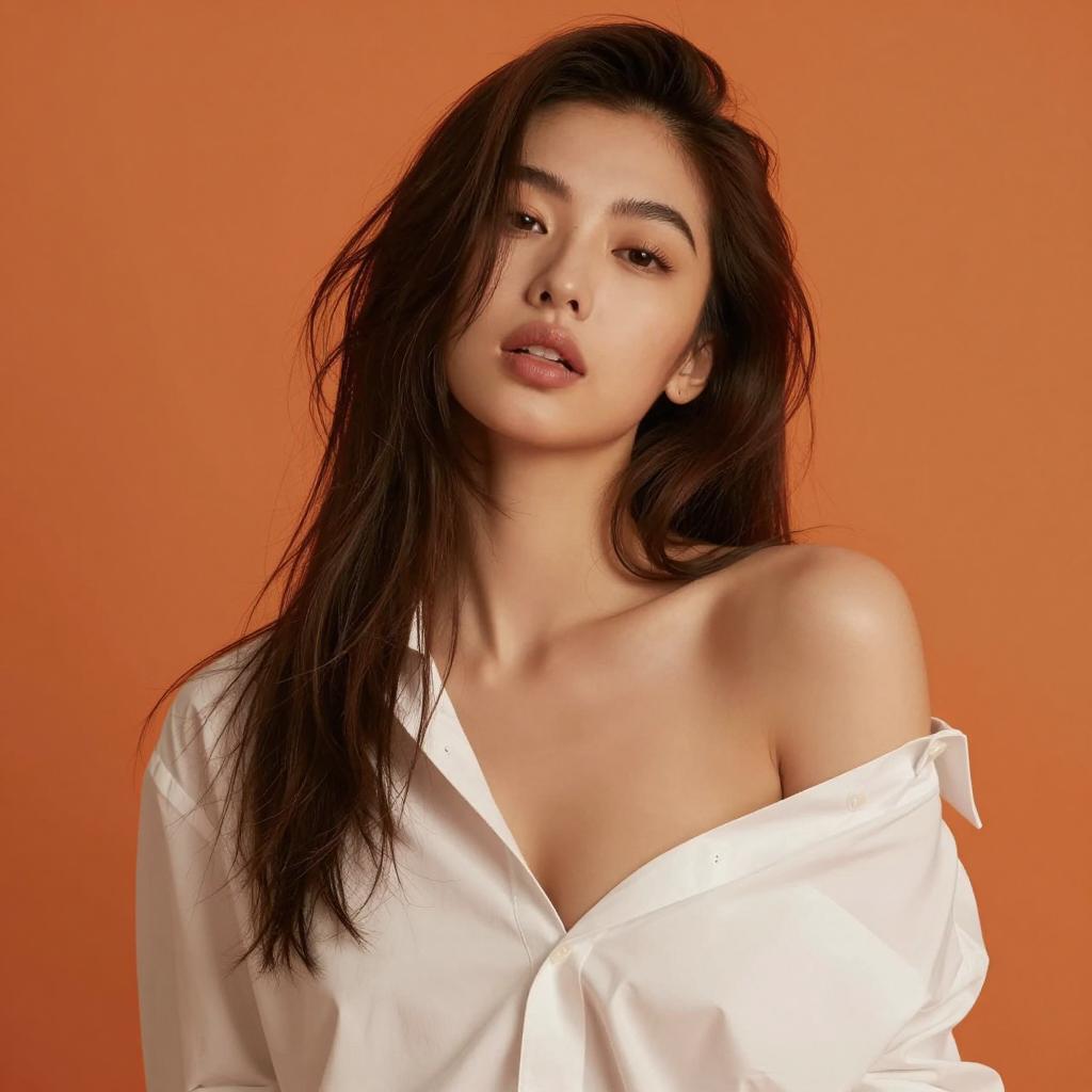 A stylish young woman poses against a warm orange background, wearing an off-shoulder white shirt that highlights her relaxed yet confident demeanor. The image captures a contemporary, minimalist beauty style favored by Gen Z, emphasizing natural makeup and effortless hair.