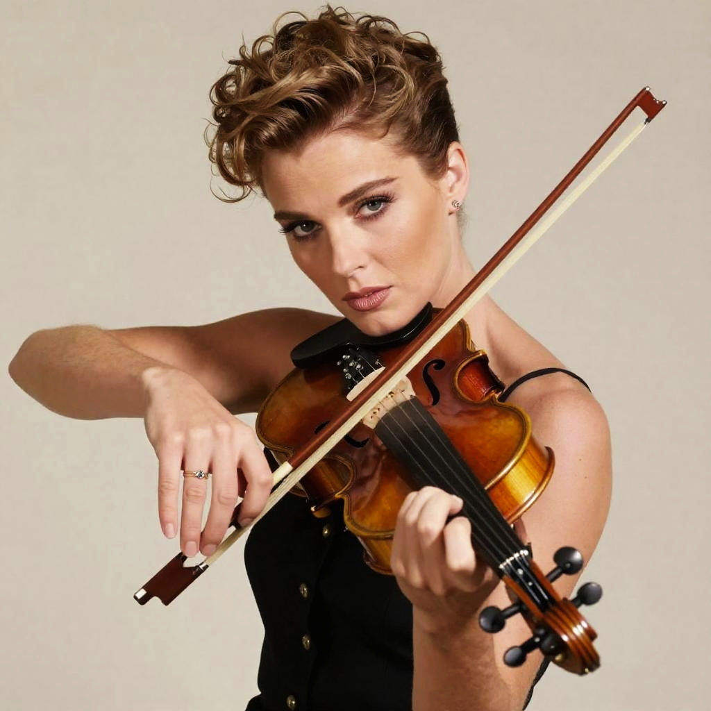 A focused woman with short curly hair plays the violin against a plain beige background, showcasing her skill and passion for music. Her intense gaze and elegant black sleeveless top highlight a modern yet classical style in this expressive portrait.