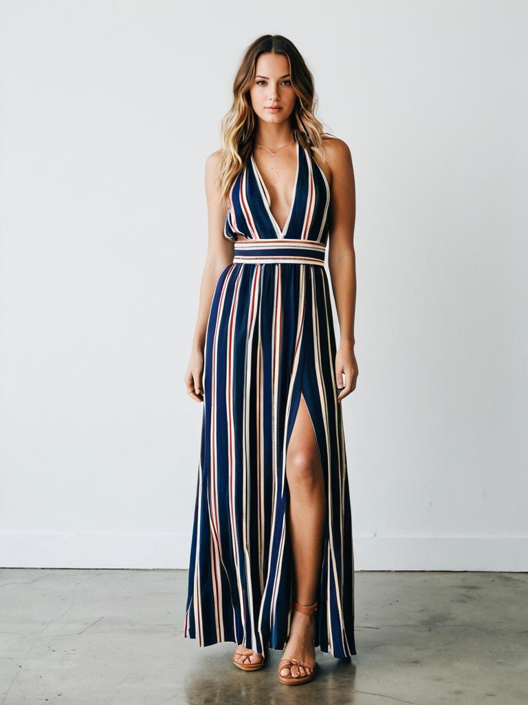 Elegant Navy Blue Striped Maxi Dress with Deep V-Neck and Slit