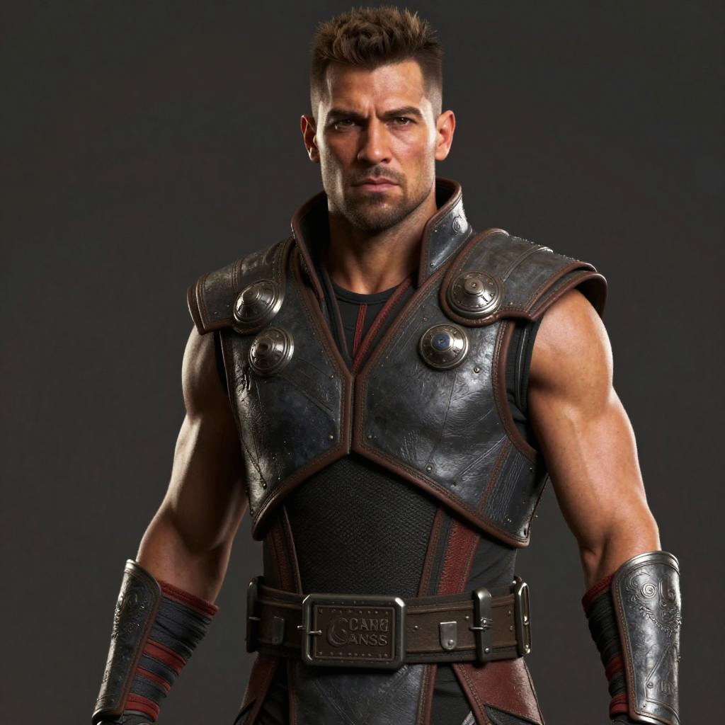 A muscular man dressed in detailed fantasy armor stands confidently against a dark background. The armor features intricate metal and leather elements, highlighting a warrior style inspired by medieval or fantasy genres. His intense expression and strong pose emphasize strength and determination.