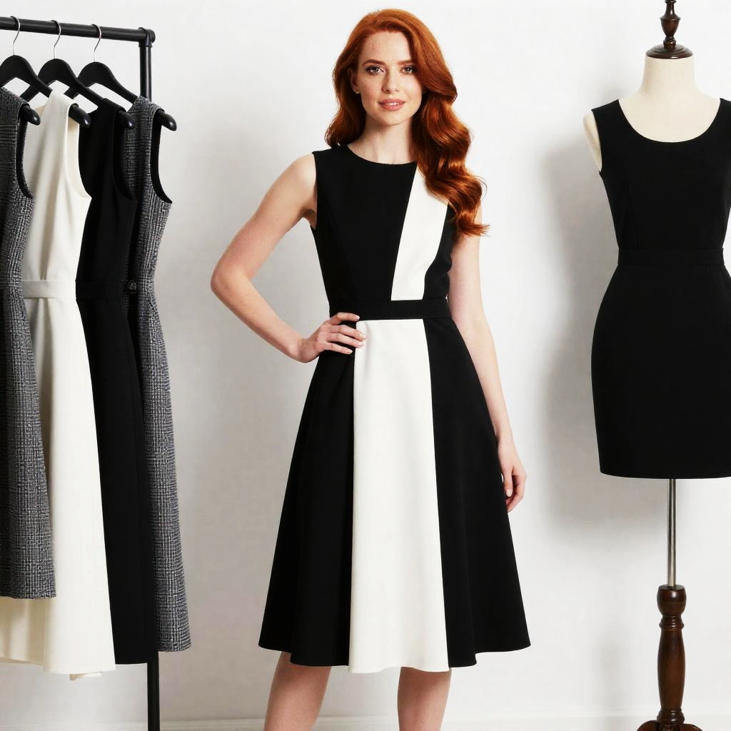 A stylish woman with red hair models a black and white monochrome dress with a modern, color-block design. Surrounding her are additional dresses on a rack and a mannequin, showcasing a collection of elegant designer clothing suitable for various formal occasions.