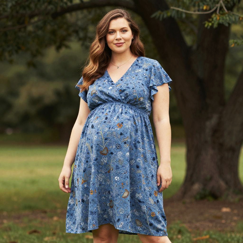 A plus-size pregnant woman is standing outdoors wearing a loose, blue floral summer dress with short flutter sleeves and an empire waist. The dress features a delicate bird and flower pattern, combining comfort with a stylish, feminine look perfect for warm weather.