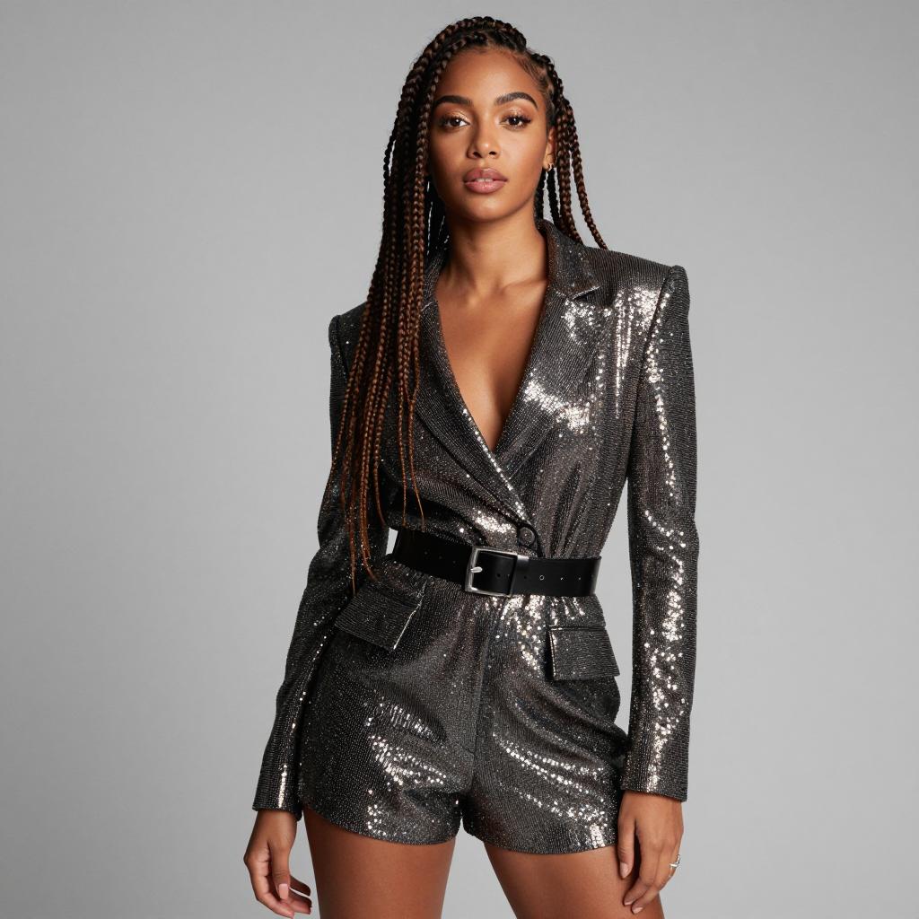 A confident woman poses in a stylish, metallic sequin blazer and shorts set, cinched at the waist with a black belt. Her long, braided hair complements the modern, glamorous look against a neutral gray background.