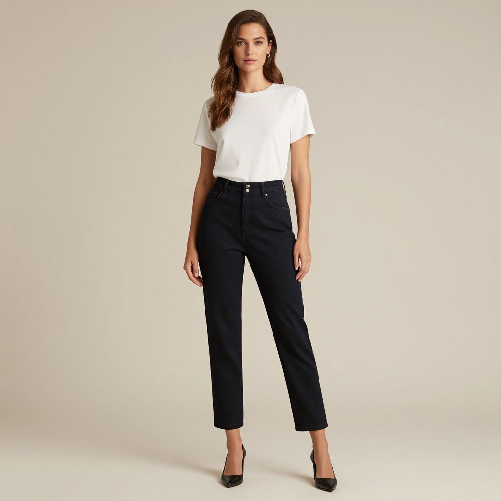 A woman stands confidently against a neutral background, wearing a plain white t-shirt tucked into high-waisted black jeans and paired with black heels. The look is minimalist and modern, emphasizing clean lines and classic wardrobe staples.