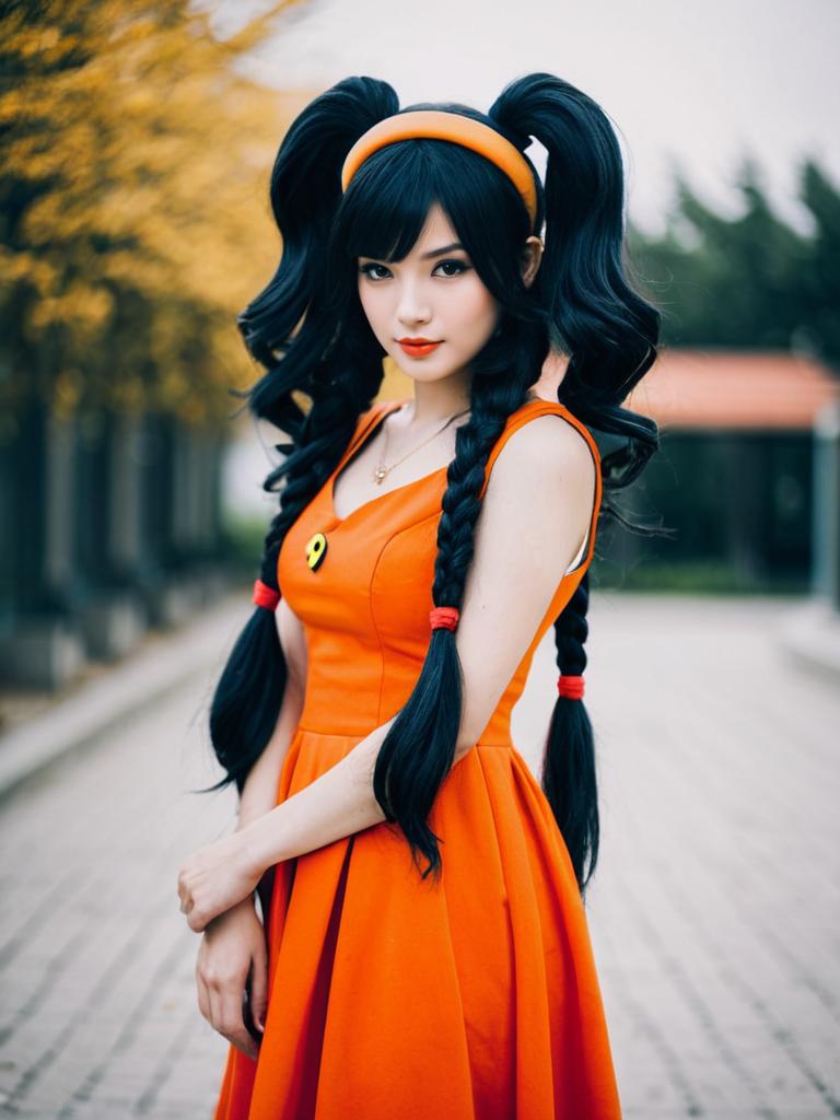 A woman with long, styled black hair and twintails poses outdoors in a vibrant orange dress and matching headband. The photo has a soft, focused background with warm tones, giving it a polished and professional appearance.