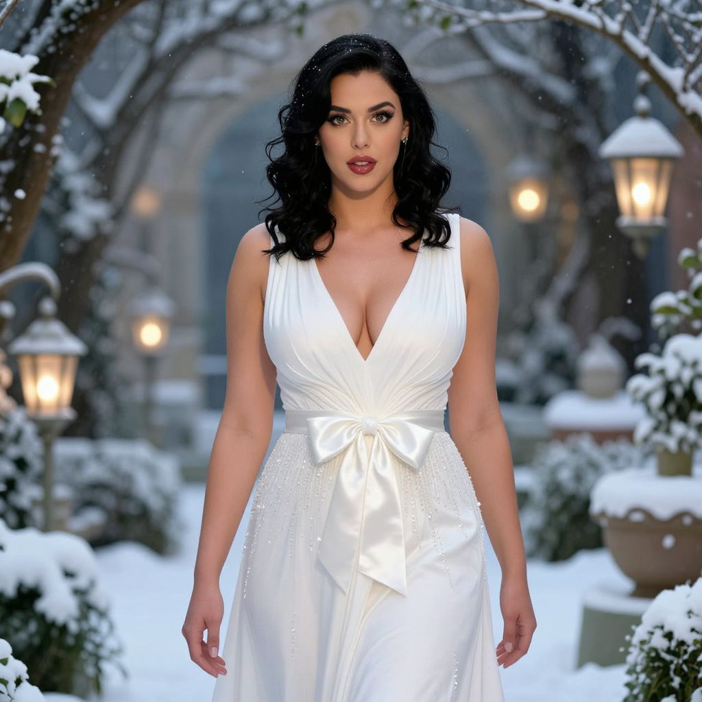 A stunning woman with dark wavy hair models an elegant white dress featuring a deep v-neck and a satin bow at the waist, standing outdoors amidst a snowy garden path lit by classic lanterns. The serene winter setting enhances the timeless and sophisticated style of the gown, blending modern glamour with a fairy-tale ambiance.