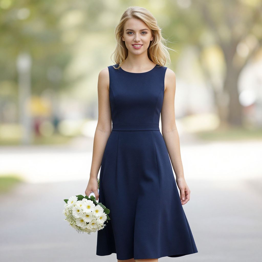 A young woman is walking outdoors on a sunny day, wearing a sleeveless navy blue dress that flares slightly at the hem. She holds a bouquet of white daisies in her right hand and smiles softly with a natural background of trees and blurred surroundings.