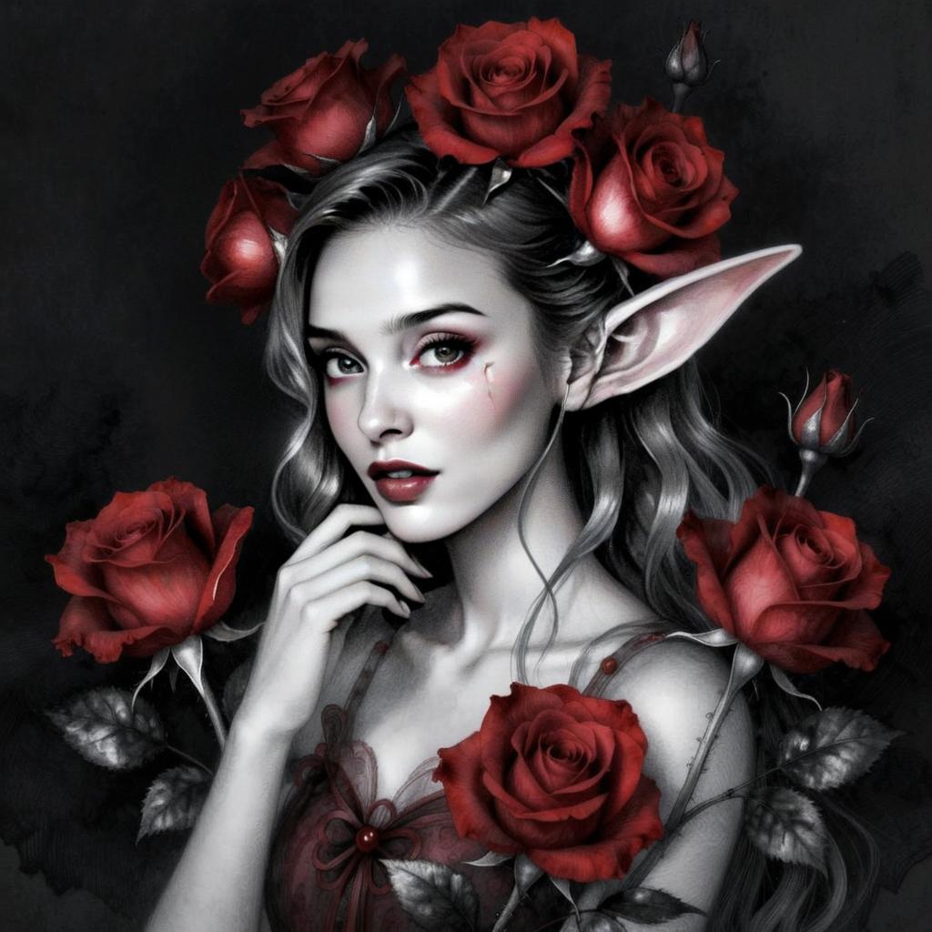 A beautifully detailed digital illustration of a young woman with elongated elf-like ears, adorned with a crown of vivid red roses. The artwork combines monochromatic tones with striking red accents, emphasizing the ethereal and fantasy-inspired nature of the character in a dark, moody setting.