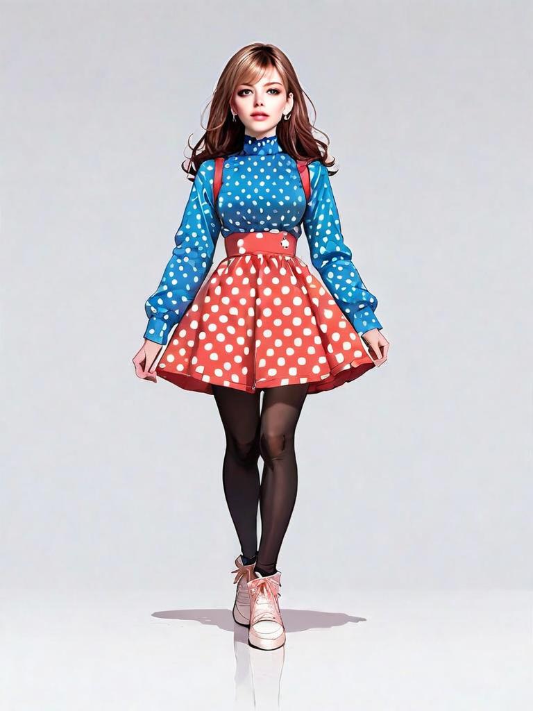 A stylish woman is depicted in a full-body shot wearing a vibrant polka dot outfit with a blue long-sleeve top and a red skirt. The digital artwork blends realistic facial features with a comic-inspired style, showcasing details such as glossy pink shoes and dark tights against a clean, minimalistic background.