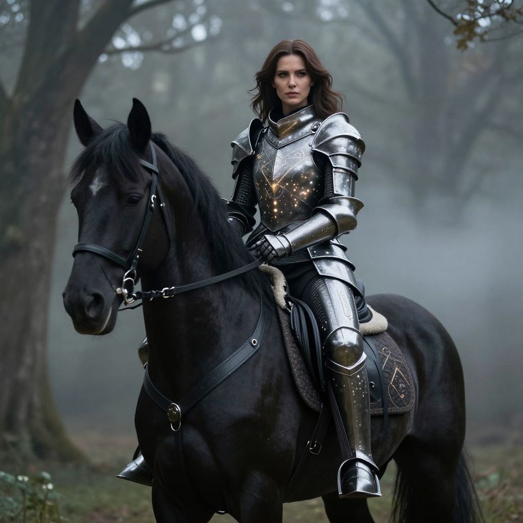 A woman clad in ornate, shining medieval armor rides a majestic black horse through a misty, forested landscape. The intricate detailing on her armor and the horse's saddle suggests a high-fantasy or medieval-inspired style, evoking a sense of strength and nobility.