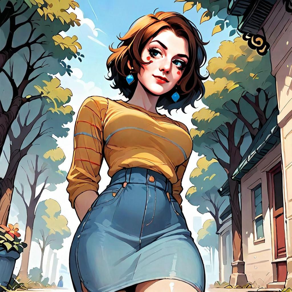 A confident young woman with short brown hair and blue earrings stands outdoors on a tree-lined street under a clear blue sky. She wears a fitted yellow top and high-waisted denim skirt, portrayed in a vibrant, stylized comic art style with strong lines and bright colors, capturing a lively and inviting atmosphere.