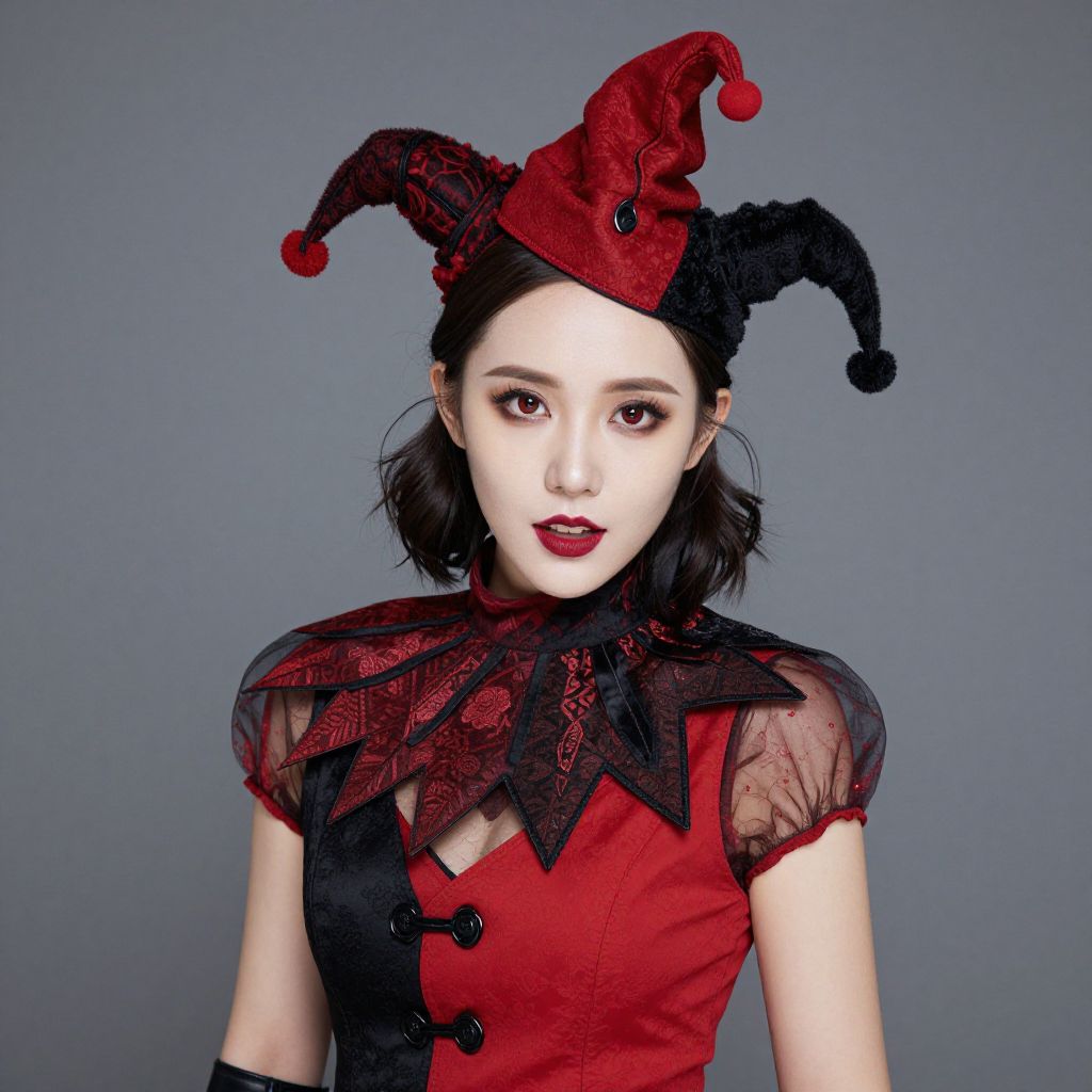 A woman dressed in a striking red and black jester costume, featuring a two-toned jester hat with pom-poms and a patterned collar with sheer puffed sleeves. Her makeup is bold, with dark red lipstick and dramatic eye makeup, complementing the theatrical and gothic style of the outfit. The neutral gray background highlights the vivid colors and intricate design details of her costume.