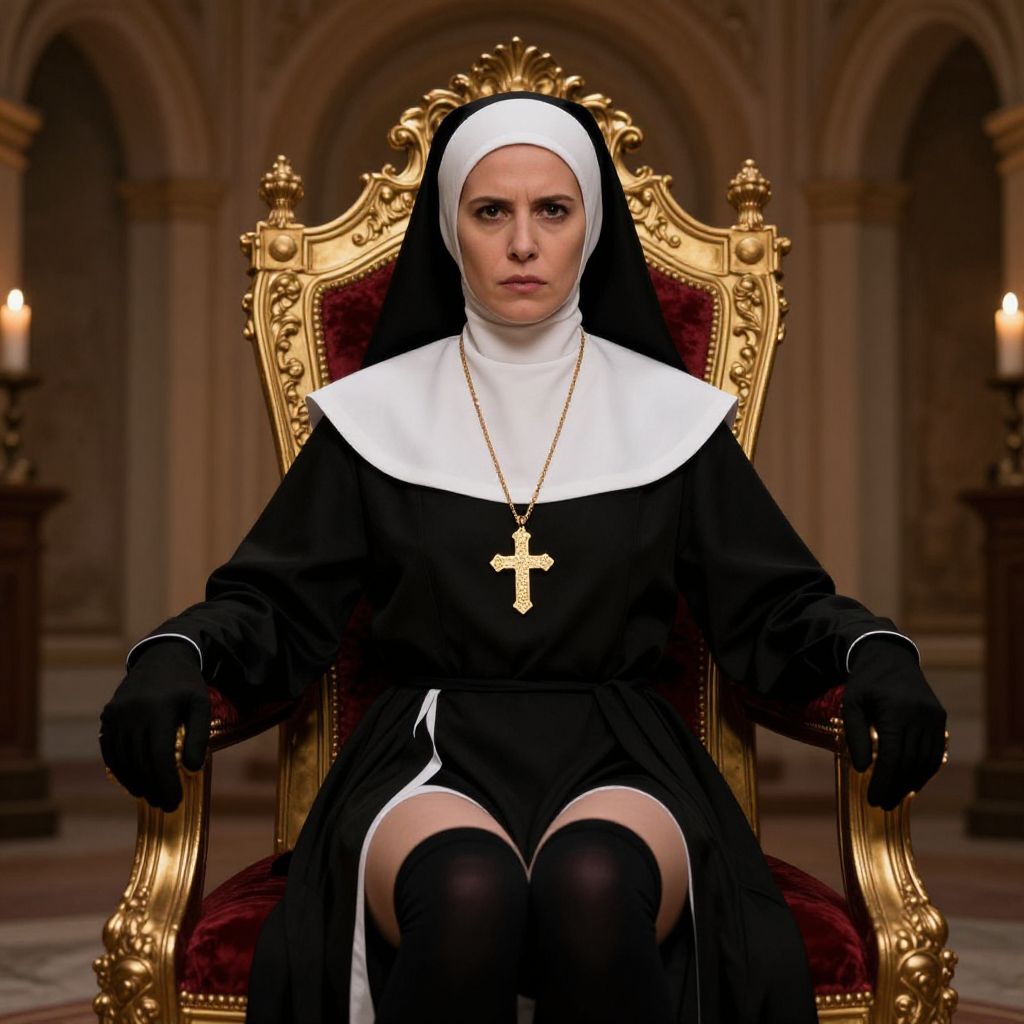 A stern-looking woman dressed as a nun sits authoritatively on an ornate golden throne in a dimly lit, classical church setting. Her traditional black habit contrasts with the modern, provocative high-cut skirt and stockings, blending classical religious symbolism with provocative fashion elements.