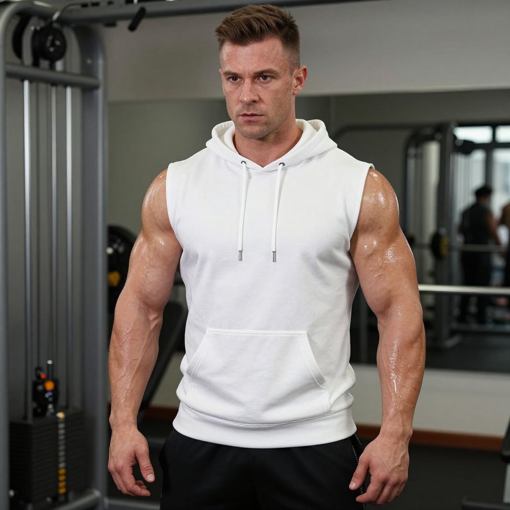 A muscular man wearing a white sleeveless hoodie and black shorts stands in a gym, appearing focused and determined. His well-defined arms glisten with sweat, highlighting an intense workout session in a modern fitness environment.