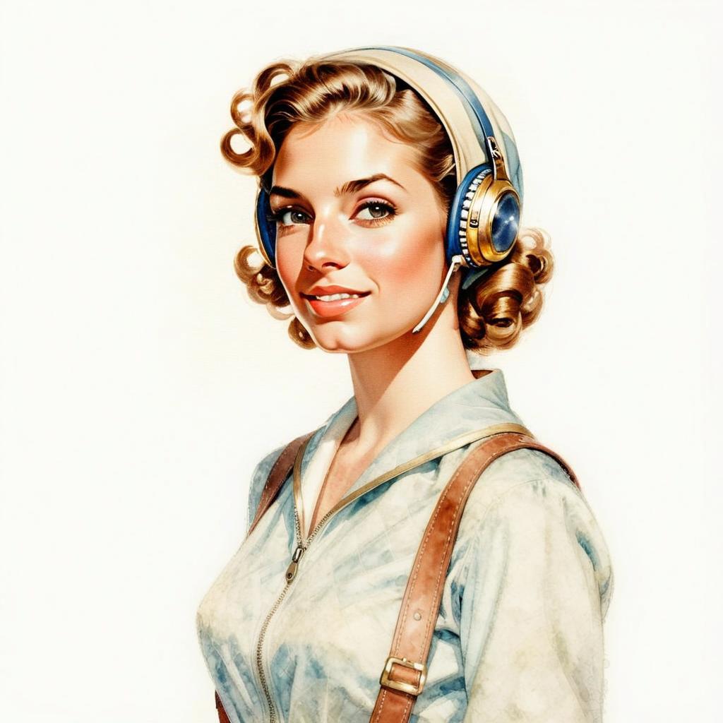 A stylish young woman with retro-inspired curly blonde hair wears large vintage headphones and a light-colored zip-up jacket with brown leather straps. The image captures a nostalgic, vintage pin-up style combined with modern elements, showcasing a confident and cheerful expression.