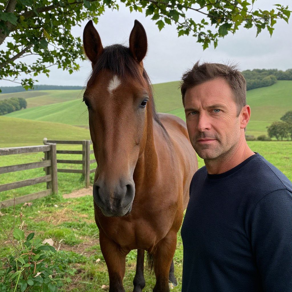 A man stands closely beside a brown horse in a lush, green countryside setting. The peaceful rural landscape, with gently rolling hills and a wooden fence, provides a serene backdrop to this intimate moment between human and animal.