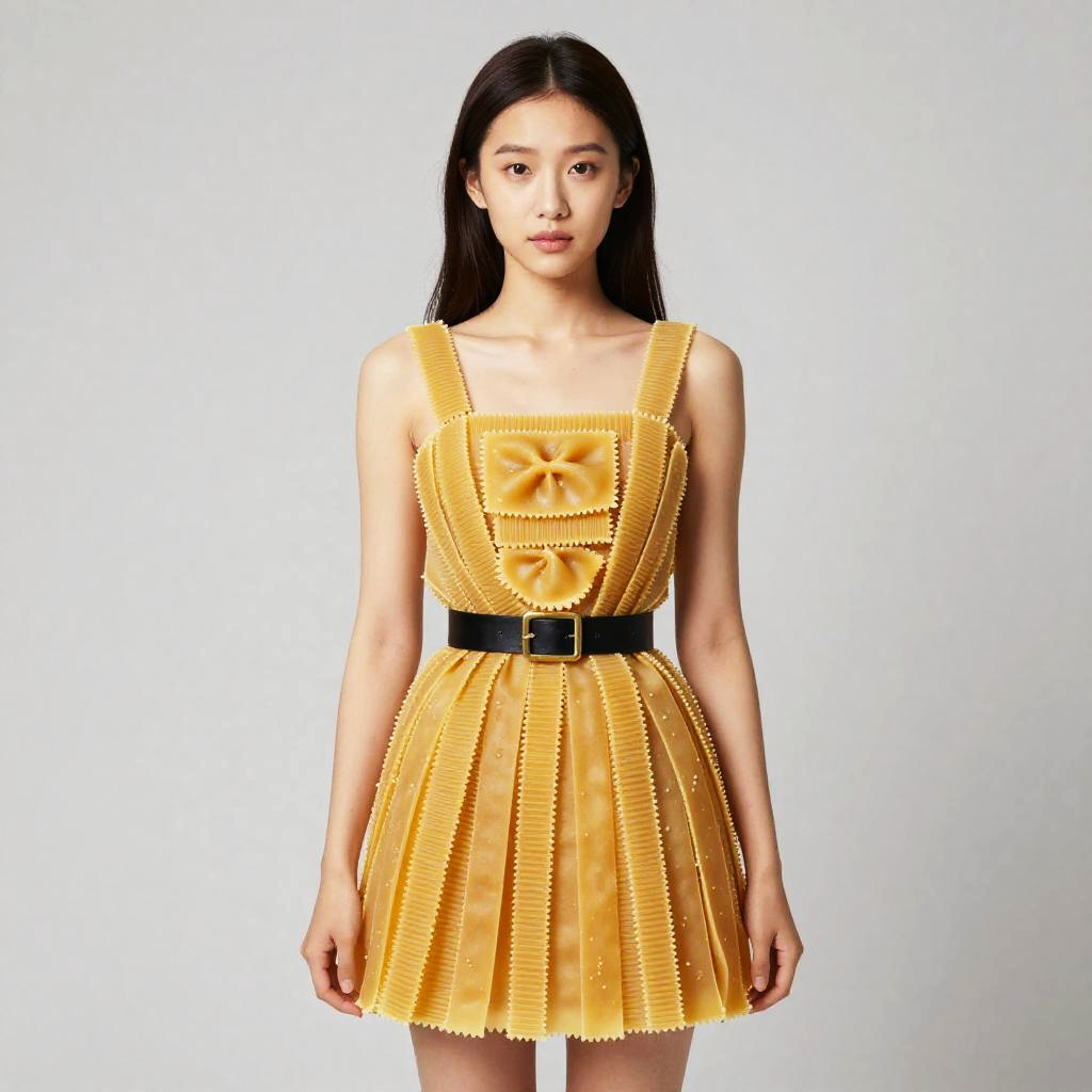 A young woman stands confidently against a neutral background wearing a unique dress made entirely from uncooked pasta, including lasagna and farfalle shapes. The creative ensemble is cinched at the waist with a black belt, highlighting an avant-garde fashion concept inspired by unconventional materials and modern minimalism.